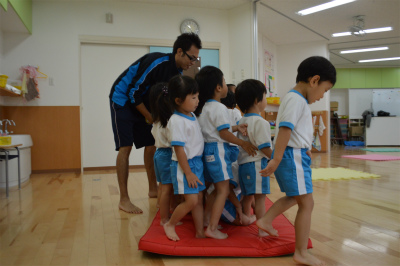 今日はみんなの楽しみにしている体操教室の日です(*^_^*) ほし組さんの体操教室を覗いてみました! まずは準備体操(*^_^*) 手先から足先までしっかりと準備運動します!(^^) つぎはかけっこ(^-^)黄色の跳び箱…