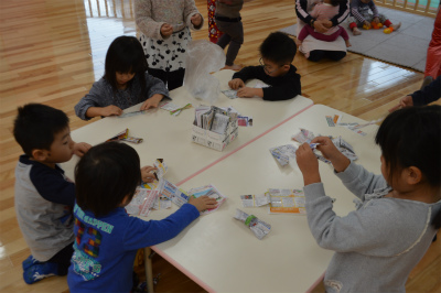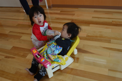 今日は朝から可愛いお店屋さんがオープンしました。 大きいお姉さんが「ぬいぐるみ屋さんとボール屋さんで~す♪」と声をかけると 男の子も女の子もみんな集まって品物を選んでいました。 おやつを食べた後は、幼稚部さんと保育部…