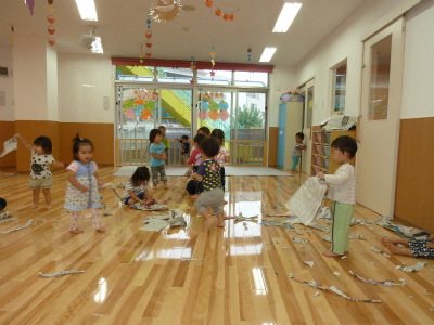 今日のいちご組さんは、新聞ビリビリをしました(*^_^*) 新聞を切ったり、丸めたり、しっぽを作って変身!! たくさん遊んだ後に、新聞のお風呂を作りました(^_^)/ みんなで順番にお風呂に入り、手をゴシゴシ♪足をゴシゴ…