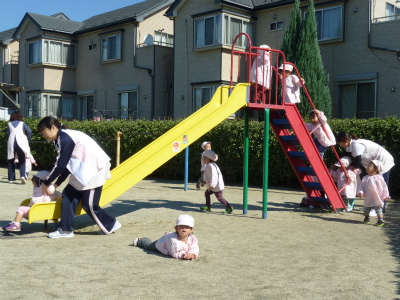今日のいちご組さんは、ふれあい公園で遊びました(^O^) はじめは大きなすべり台が大人気!! みんな一生懸命に階段を上っています。 シューと滑り気持ち良いさそうです。 すべり台が落ち着くと・・・  …
