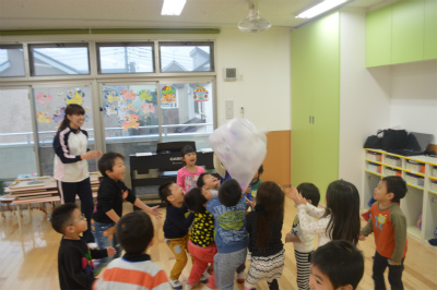 今日は雨だったので幼稚部のお友達は室内でゲームをしました。 ポリ袋の中に、みんなで作った小さな袋を詰めた「ポリ袋ボール」で 床に落とさないように友達と協力して上にあげたり(#^.^#) 友達と抱き合って、ボ…