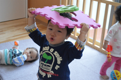 今日のもも組さんは室内で遊びました(*^_^*) 最近子ども達がお気に入りな型抜きマット! 頭に被ろうとしている姿も♪ 先生の足の上に乗り電車ごっこ♪しっかり掴まってしゅっぱーつ…