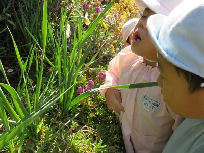 今日は、保育部・幼稚部合同で園周りのお散歩、園底遊びをしました(*^_^*) お天気にも恵まれ、お散歩日和です(^v^)♪ みんなで「さんぽ」を歌いながら出発! 園庭で遊ぶ前に、幼稚部のお友だちがアイリスの…