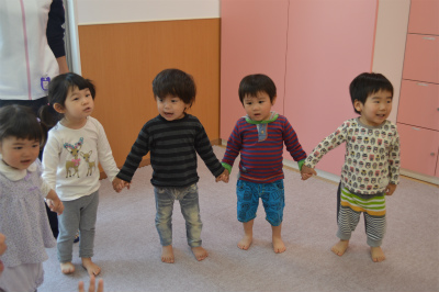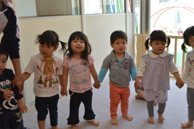 お友達と手を繋いで大きな声で