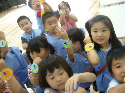 「時の記念日~」と答えました。一生懸命作った時計を一人一人腕に付けてハイチーズ!!