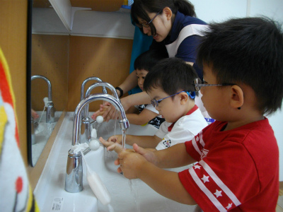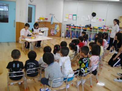 看護師の金谷先生と山田先生に手洗い指導を受けていました!