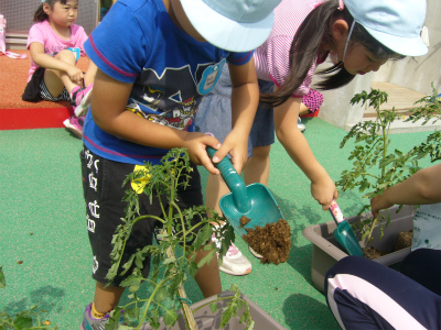 幼稚部のお友達は、園底にトマトとピーマンを植えました!