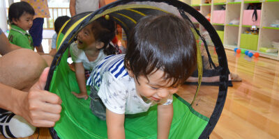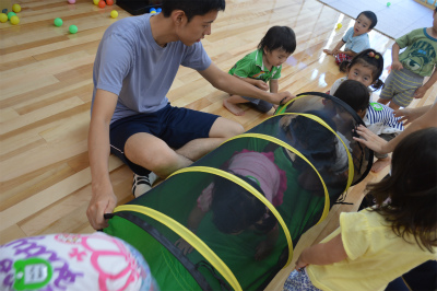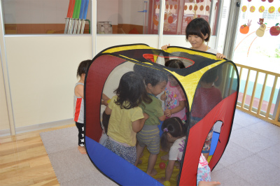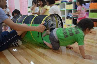 トンネルだ~~!(^^)!みんな興味津々。ボールプールを出してつなげました。