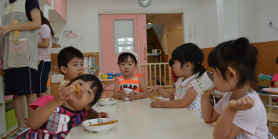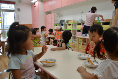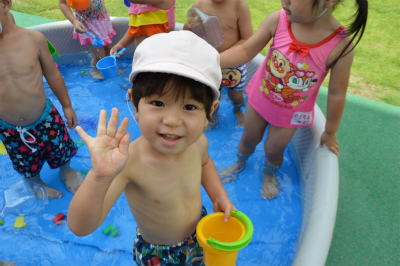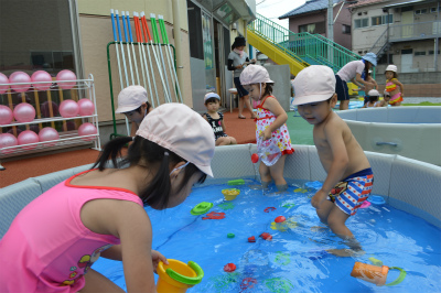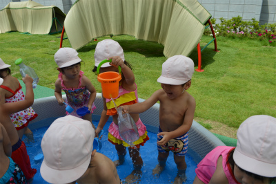 さて、おやつも終わり、水着に着替えて大好きなプール遊びです(^^)♪