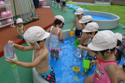 バケツにお水をたくさん入れてお水屋さんをするお友達もいれば、