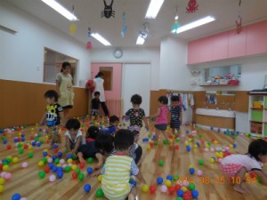 雨天のためお部屋でボールプール、トンネル遊びをしました!
