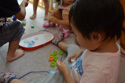 最近のめろん組ではキャップにひもを通す遊びが大人気です!(^^)!