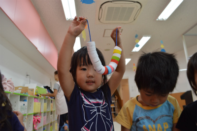 真剣な表情でひもを通して完成すると「先生、見て!」と嬉しい顔を見せてくれます