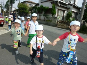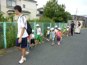 おやつを食べた後は、幼稚部さんと保育部さんが一緒にお散歩へ出かけました。