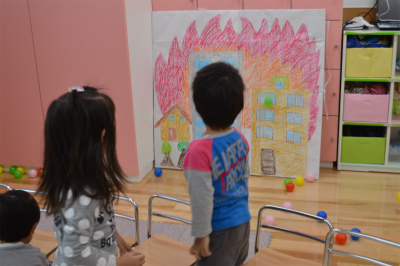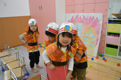 10月212014にじいろブログ今日のめろん組さんです お部屋でいろいろな色のボールを使い遊びました! ボールで遊んでいると大きな絵が出てきて、的当てゲームをしています みんな狙いを定めて力いっぱいに投げています(#^.^#) その後には運動会の親子競技で行った「火を消せレスキュー」 の消防士さんの衣装を着てお友達と仲良く消防車に乗って出動していました 運動会の後でもみんな楽しそうな表情をしていました(*^。^*) Post navigationPreviousPrevious post:10月20日(月)NextNext post:10月22日(水)