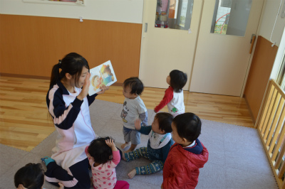 絵本を見ながら先生の真似をし「はーい」とお返事をする子ども達。