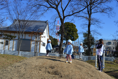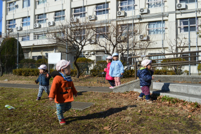 公園の中を元気に走り回ったり、もも組のお友達はお山をハイハイで登っています!