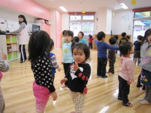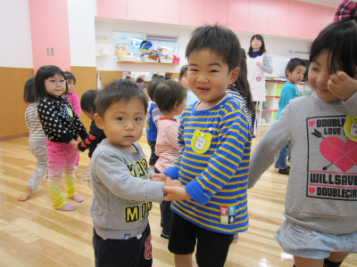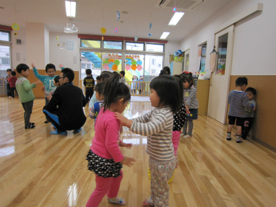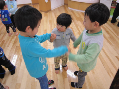 ♪しあわせなら手をたたこう トントン♪ と歌い、向かい合って両手をトントンを合わせました。