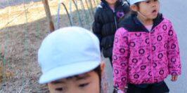 いつもは友達と手を繋いで散歩へ行きますが、今日は一列になって歩きました。