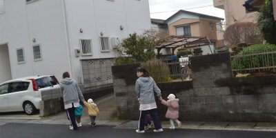 先生と手を繋いで一歩一歩、一生懸命歩いています。