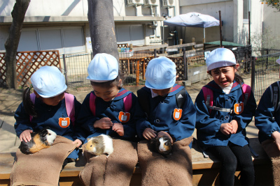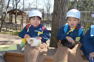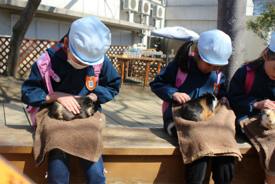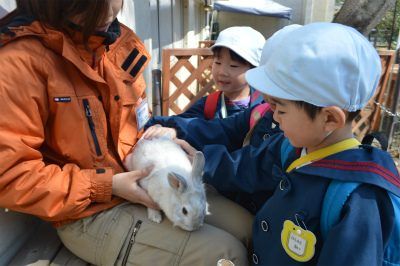 ウサギやモルモットを膝の上に置き、直接なでなでしました。子どもたちからは「あったかーい、ふわふわしてかわいい」などいろんな感想を飼育員さんたちに話していました☆