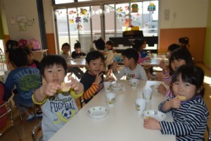 先生やクラスのお友達と一緒に楽しくお弁当を食べていました。一生懸命作ってくれたお家の人にしっかりと「ありがとう」を伝えてくださいね(^^)