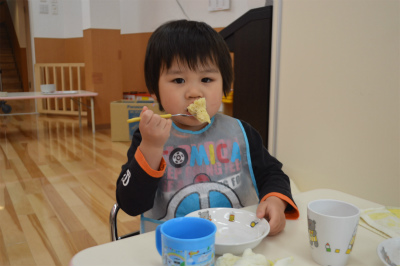 給食やおやつを食べるときにはお皿を左手でおさえ食べています