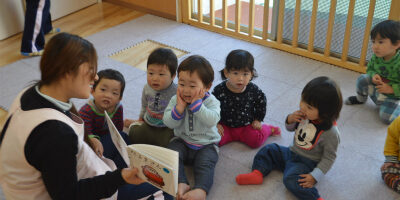 絵本を見ながらいろいろな反応をする子ども達。