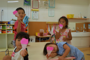 そら組さんがほし組のお友達に、たいよう組さんがそら組、ほし組のお友達に作り方を教えていて