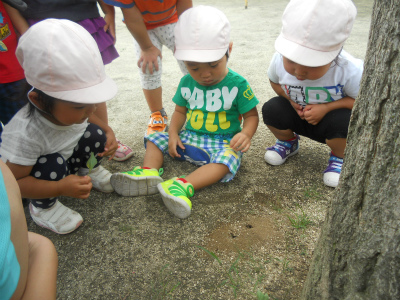 木の下に少し大きな穴を発見!!いちご組もめろん組のお友達も興味津々で「なにがいるの?」と聞いたりしてじっと見つめていました☆