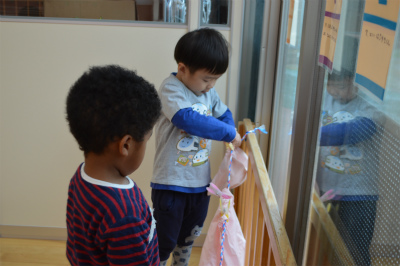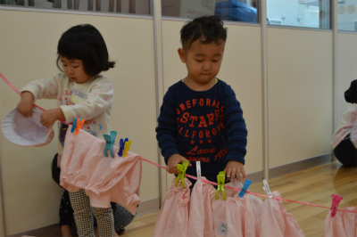 洗濯ばさみでよく遊んでいるので、手先を使って器用につまみ、きれいに並べて干すことができました。