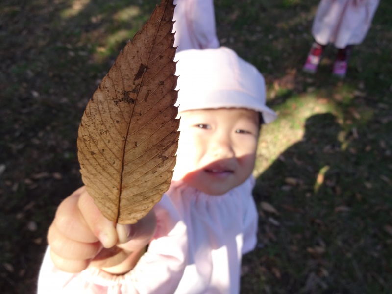 おおきな落ち葉を見つけ、とっても嬉しそう♡