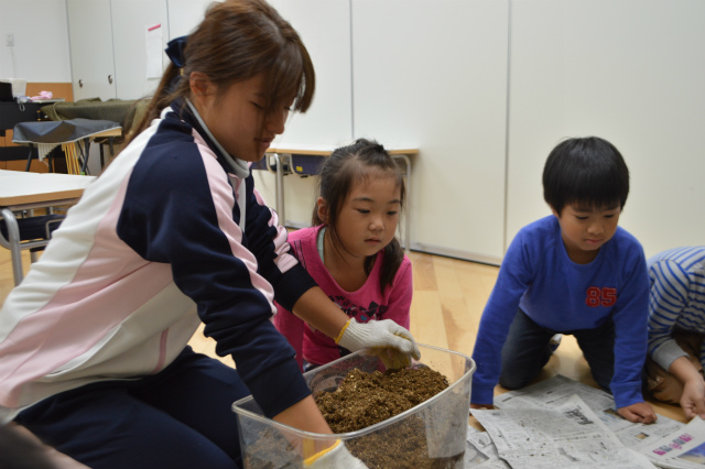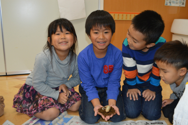 保育園に帰った後はカブトムシの幼虫が入っている土を変えるときに