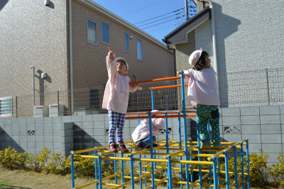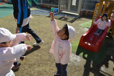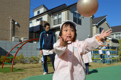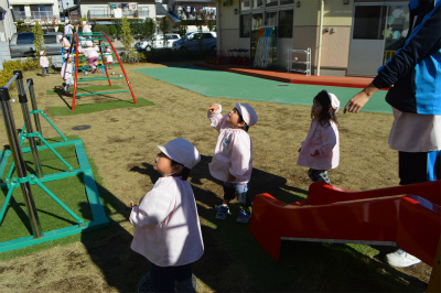 そのあとの園庭遊びでは、ボールや太鼓橋、ジャングルジムなど