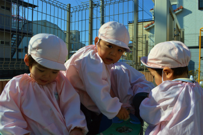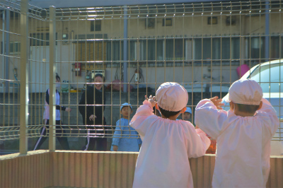 幼稚部さんが散歩に行く姿を見て「ばいばーい」「いってらっしゃーい」とバイバイして見送っていました。