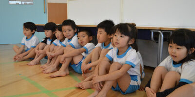 てっちゃん先生となつき先生のお話を、体操座りで聞いています。