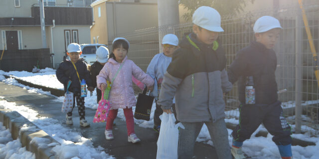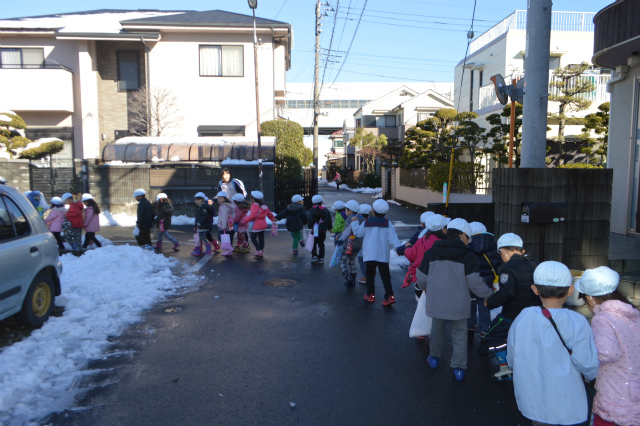 昨日の雪がまだ道に積もっていた今日、幼稚部さんは朝から上履きを持ってどこかに向かっているようです!