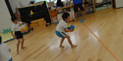 今日は体操教室で、たいよう組さんの大好きなドッヂボールをしました。女の子対男の子で勝負をして大盛り上がり!!たくさん体を動かして汗をかきました。