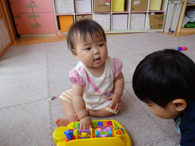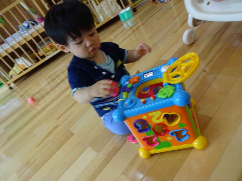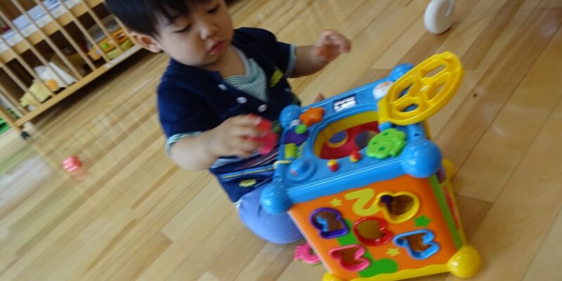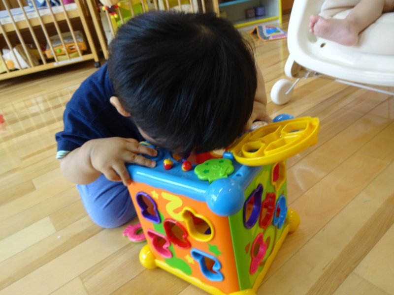 保育者が歌を歌うと反応し、手に持っていたおもちゃを