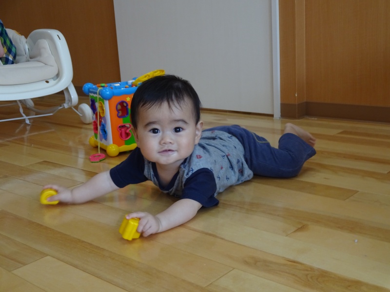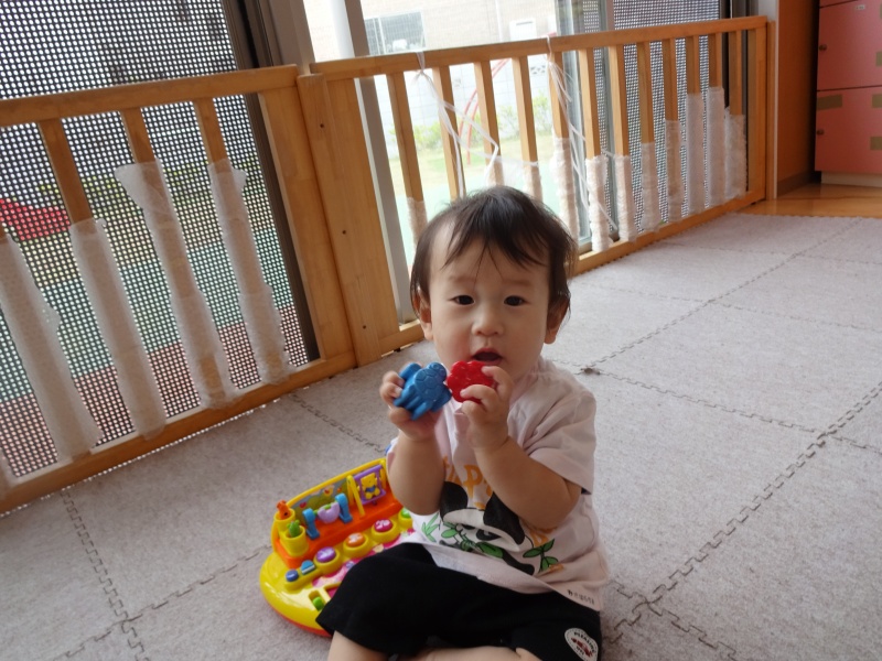 両手に玩具をもっていて、とても満足そうな笑顔ですね♪