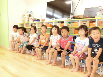 部屋の中で幼稚部の友達がかっこよく座っています。
