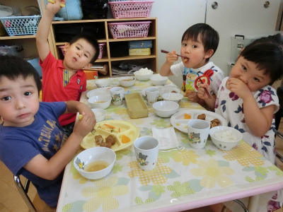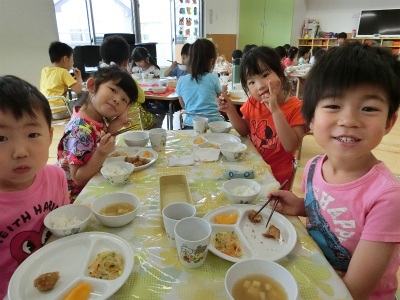 たくさん体を動かした後はみんなが大好きな給食の時間です!