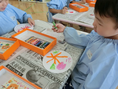 7月122016にじいろブログ 今日はそら組の様子です(*^-^*) みんなでカラーガードの練習です。 まっすぐカラーガードを持っていてかっこいいですね(^◇^) 次ははじき絵です。 クレヨンで好きな絵を描いたら・・・ 上から 絵の具を塗ってはじき絵の完成です(*^-^*) 絵の具がはじくのが面白かったようでみんな真剣にやっていました。 上手に出来てよかったね(*^▽^*) Post navigationPreviousPrevious post:7月12日(火)NextNext post:7月14日(木)
