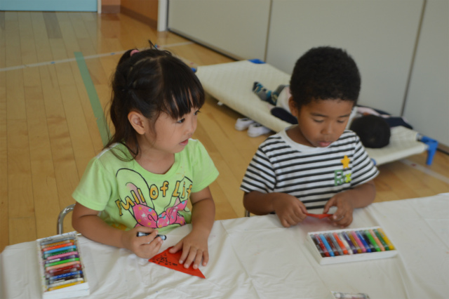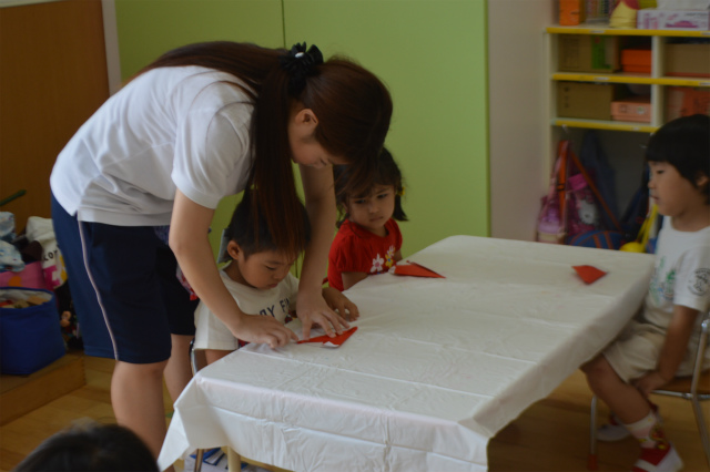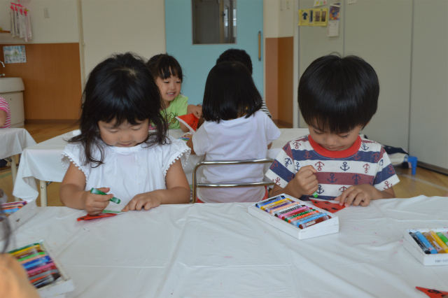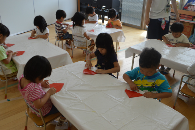 8月82016にじいろブログ今日のほし組さんは午前中にプールに入りました♫ おもちゃなど使って楽しく遊んでいました(^○^) 午後はお部屋で折り紙ですいかを作りました☆ 先生の見本を見ながら上手に折っていて、出来上がると 「先生できたよ~」とうれしそうに教えてくました(*^_^*) 折り終わったらクレヨンで種を描きました♪ とても上手にできていました\(^o^)/ Post navigationPreviousPrevious post:8月4日(木)NextNext post:8月9日(火)