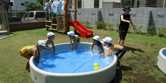 じょうろにお水をくんだり、プールの壁に背をつけて友達と