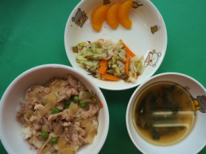 9月152016にじいろ給食ブログ~ 今日の給食 ~ ・豚丼 ・キャベツのゆかり和え ・ほうれん草と人参のみそ汁 ・みかん ~ 今日のおやつ ~ ・牛乳 ・お月見団子 (もも組:麦茶・牛乳プリン・おせんべい) Post navigationPreviousPrevious post:9月15日(木)NextNext post:9月16日(金)