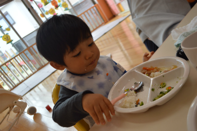 保育園に帰ると大好きな給食です。