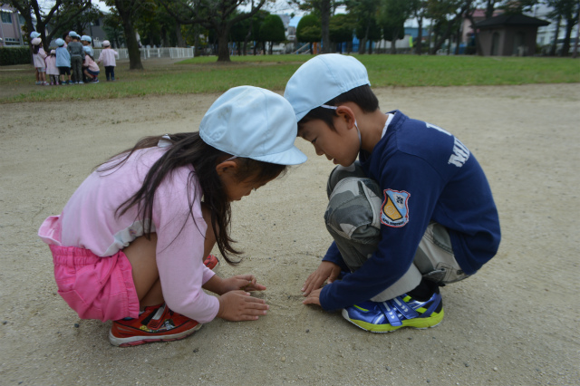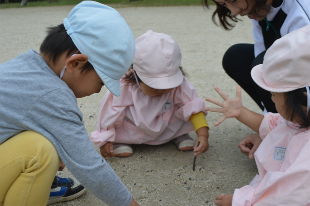 いちご組さんは先生と一緒に砂の上にぐるぐるとお絵かきです!