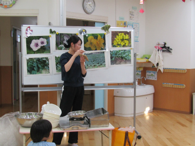 まずは、給食の先生がいろいろな野菜の畑やお花の写真でクイズを出してくれました。