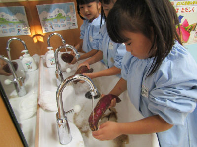 おいもの洗い方の説明も静かに聞いていました。